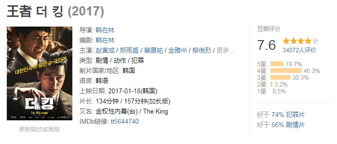 本片由韩在林指导,赵寅成和郑雨盛主演,赵寅成凭借此片一举获得韩国电影青龙奖最佳男主角提名,郑雨盛更是妥妥地票房保证。本片豆瓣评分7.6分。