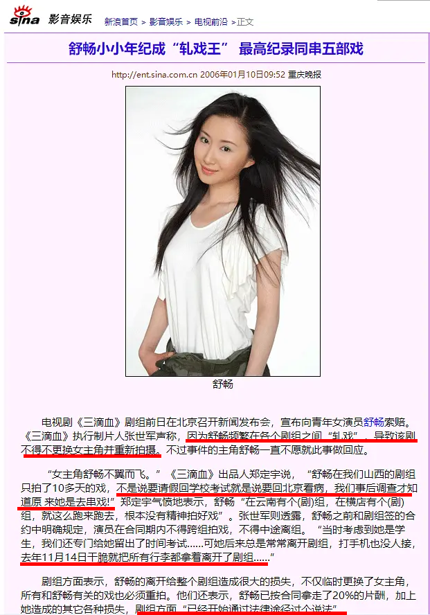 比如2006年,在舒畅最当红的时候,就被《三滴血》剧组指控轧戏。