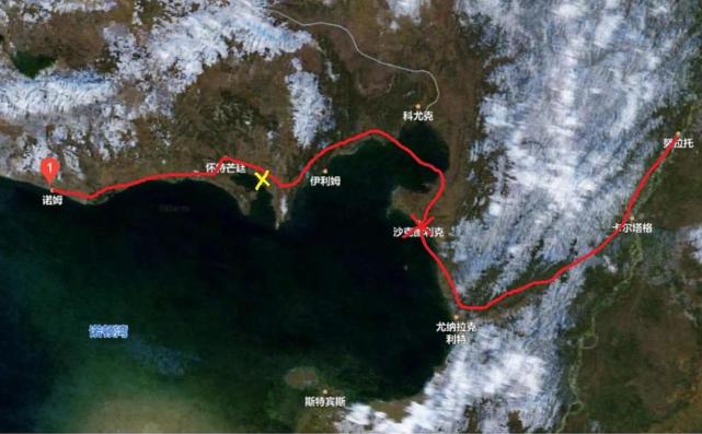 男主赛帕拉从1出发穿过诺顿湾到达 shaktoolik 也就是红叉的地方遇到从努阿托出发(火车把血清送到此地)的雪橇手,接过血清后马上返程,再次穿越冰面裂开的诺顿湾到 golovin 也就是黄色叉的地方交给下一位雪橇手,接力最后送到诺姆。