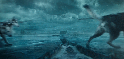 冲过一段结冰的海洋时,路面开始坍塌,分裂成很多冰块,冰下暗涌的流水刺骨,而冰块之间一直在漂浮移动,这段冰面的特效也是非常出彩,实际冰面的路途是比较远的,电影只是表现了一个长镜头。