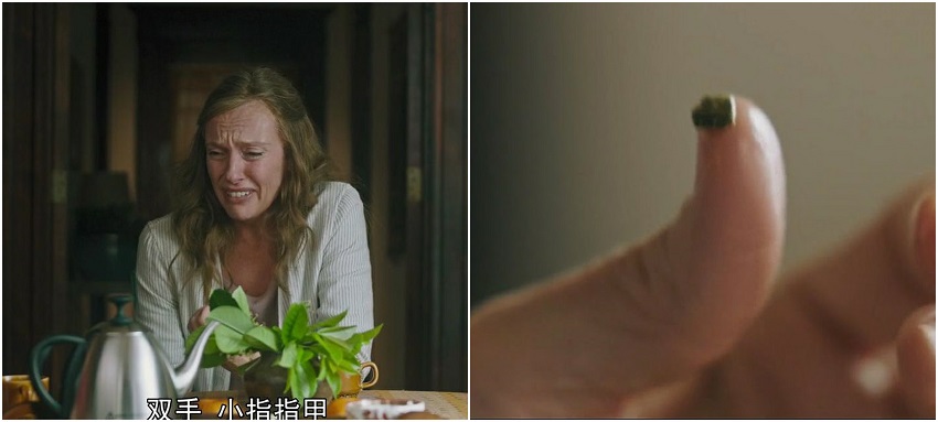 7. 露脸最多的胖大妈,是她引诱了安妮,电影中安妮第一次到她家,说查理尸体上连指甲都不见了,但吃药后喝了一口胖大妈桌上的水,然后嘴里吐出一个绿色发霉的东西,这就是查理的小指指甲。