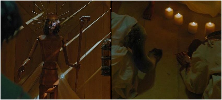 最后的仪式,奶奶艾伦和妈妈安妮的躯体跪伏在神像下,她们都没有头颅,神像上是女儿查理的头颅,这就集齐了拜蒙附身仪式需要三个女性头颅的条件。(注意观察上文插图,拜蒙的画像上挂着的三个女性的头)