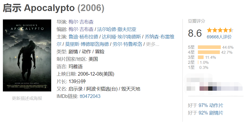 豆瓣8.6分,好于97%的动作片,别具一格的拍摄手法,史无前例的玛雅故事,让《启示》至今仍可担得起“一部沉浸式无尿点”的惊艳动作片。
