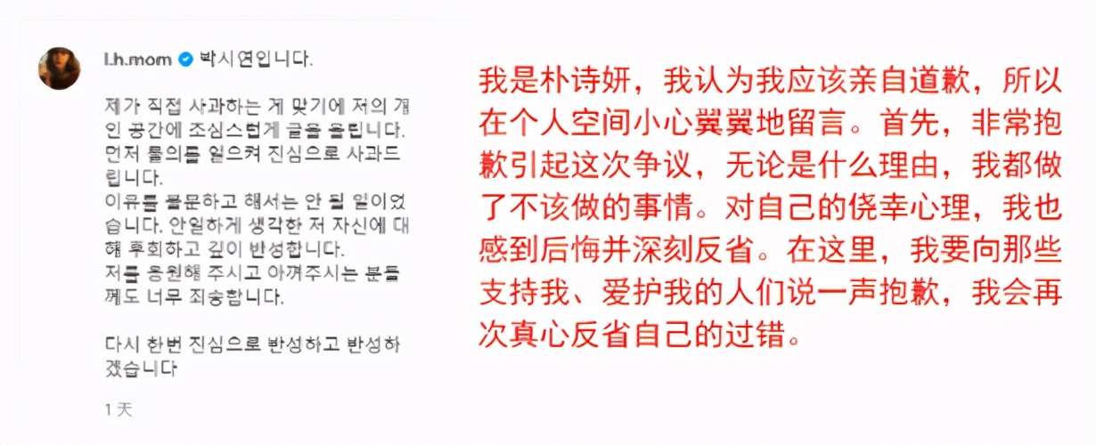 1月20号,暂时回家的朴诗妍通过社交平台发文道歉,称会真心地反省自己的过错。