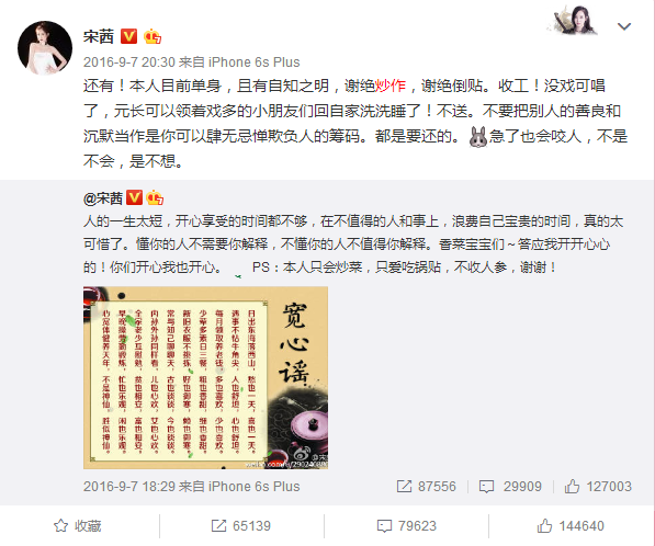 不过后来两人的关系完全形同陌路,宋茜还曾在微博宣布自己单身,“谢绝炒作,拒绝倒贴。”这些话都直指杨洋方面啊!