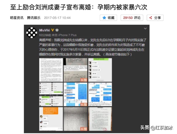 2017年5月17日,林苗在微博发表离婚声明,并称前夫刘洲成先后6次在其孕期和月子内对她实施家暴行为。