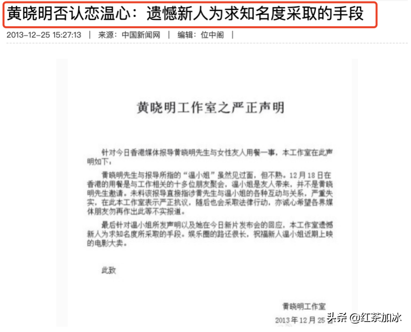 「黄晓明工作室」针对此事作出回应,称黄晓明跟温心不熟,并说:“娱乐圈的路还很长,祝福新人温小姐近期上演的电影大卖。”