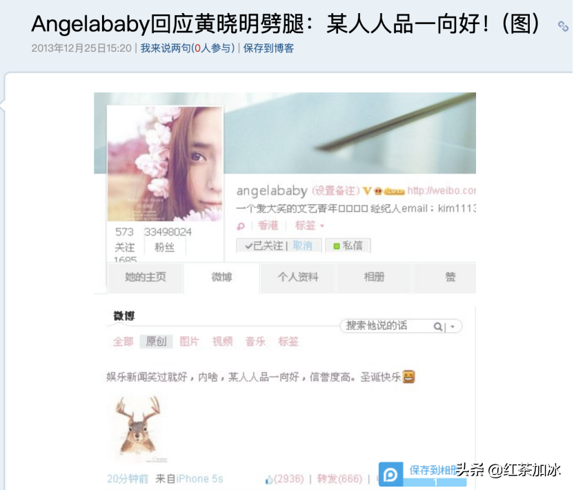 angelababy本人也发声踩了一脚,“娱乐新闻笑过就好,内啥,某人人品一向好,信誉度高。圣诞快乐!”