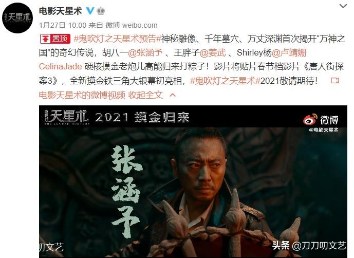 张涵予、姜武、卢靖姗主演的电影版《鬼吹灯之天星术》,1月27日发布了2021年暑期档定档预告片,全新的“摸金三人组”即将大银幕初亮相。