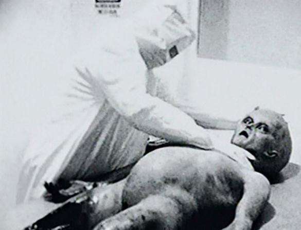 只见在这段黑白的、画质粗糙的录像中,几个穿白大褂、戴面罩的人,正在解剖一个外星人。他们用手术刀从它的脖子处切开,还撕开眼膜……
