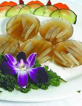 土笋冻是我们闽南最神奇最独到最有想象也最有创意的美食!常常在宴席开幕的关头,浑圆的它们就急不可待地一颗颗闪亮登场了,像对剖的水晶球晶莹剔透,似三叶虫的化石岁月悠悠?它们是东海龙宫玲珑的花坛,还是灰白相间的考古对象?初次面对它的外地客人惊讶的眼睛睁得浑圆如同它生冷的外形,心里嘀咕着:这东西真的可以吃吗?