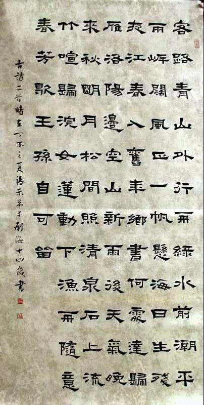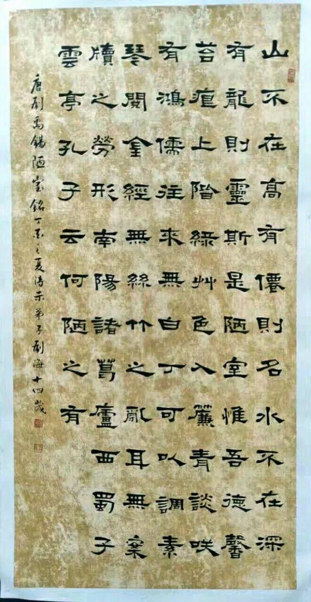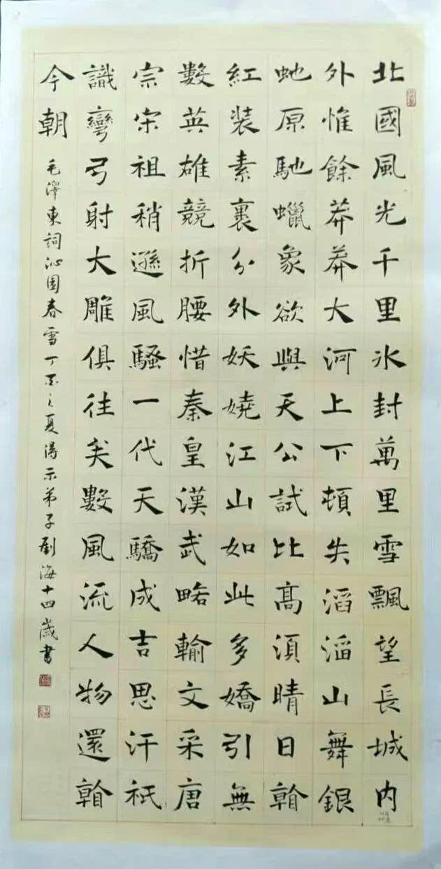 或许,在很多人的眼里,15岁还是一名孩子,但是这位15岁少年,却是一位出色的书法爱好者,不仅如此,擅长书法诸体,而且诸体皆精,凭借精湛的书法,多次斩获国展大奖,诸如第八届《书法报》全国中小学生书法大赛、第九届《书法报》全国中小学生书法大赛获一等奖、第一届“西安碑林奖”全国书法作品展等等,是一位有着丰富书法经验的书法少年,其笔下的楷书,深得褚遂良楷书之精髓,温纯生动,有谦谦君子之气,隶书整齐划一,严谨规范,深得邓如石之精髓,行书以“二王”为范,写出了一种新气象,他就是书法少年刘海男,一位将书法写到极致的少年,下面就让我们一同来欣赏一番他的书法作品吧。
