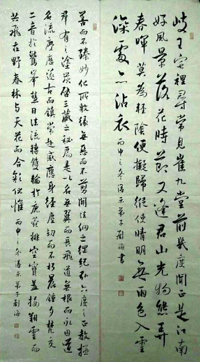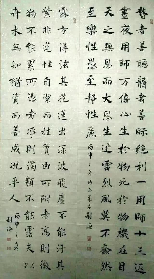 他笔下的隶书,最为精到,不但有邓石如的笔意,而且还有尹炳寿的整齐划一,很是规范,虽然点画,没有过于明显的一波三折,但是却暗藏起伏,有一种暗流涌动的感觉,而其笔下的楷书,以褚遂良楷书为宗,生动活泼,而且不缺乏美感,真是别人家的孩子,而他笔下行书,不但有“二王”范,而且有孙过庭《书谱》的神韵,真是一派大家之气象,难怪很多朋友看到他的书法作品后,都赞叹不已,甚至羡慕不已。