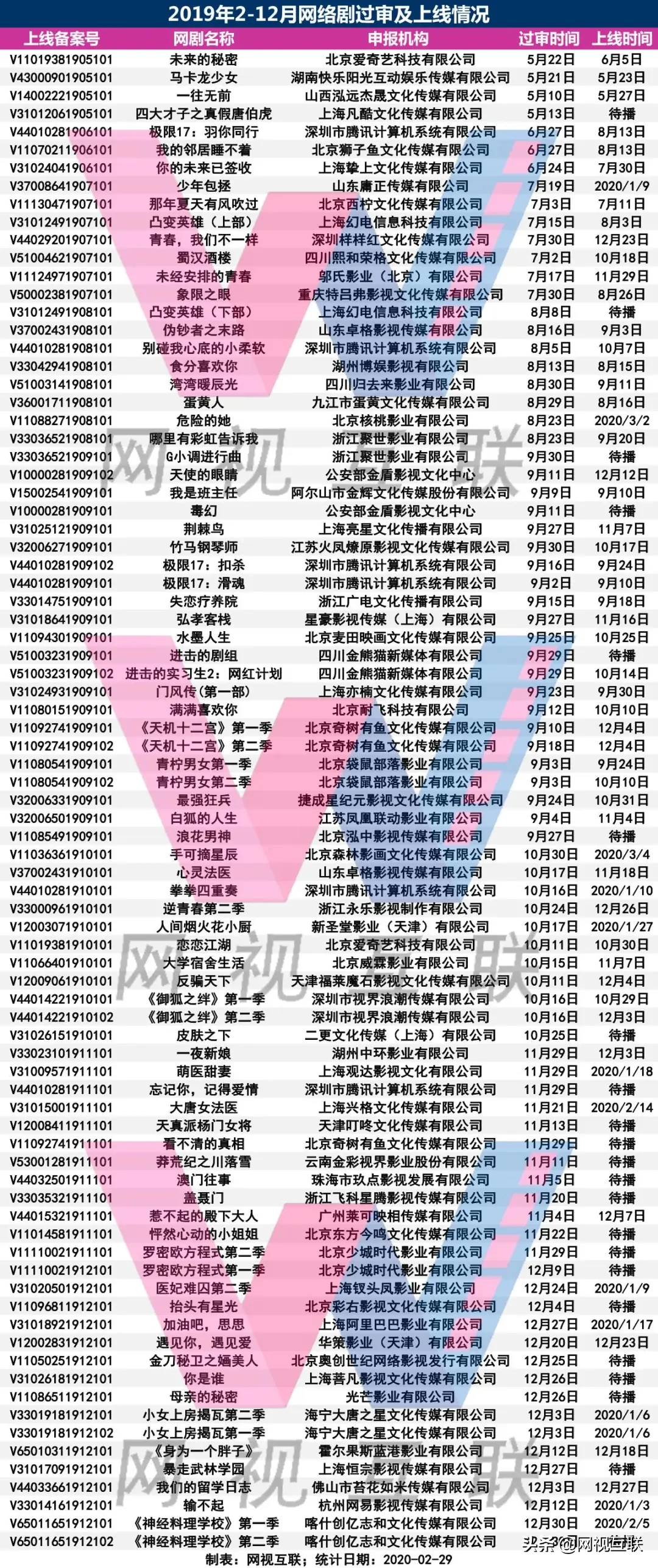 事实上,受相关政策和市场环境影响,2019年的网剧市场并没有往年那么疯狂。虽然备案(即“规划备案”)网剧暴增,运作效能也得到了明显提升,但真正拍摄并过审(即“取得上线备案号”)的网剧数量却很少,而且大多数已经上线,留给2020年的待播剧并不多。