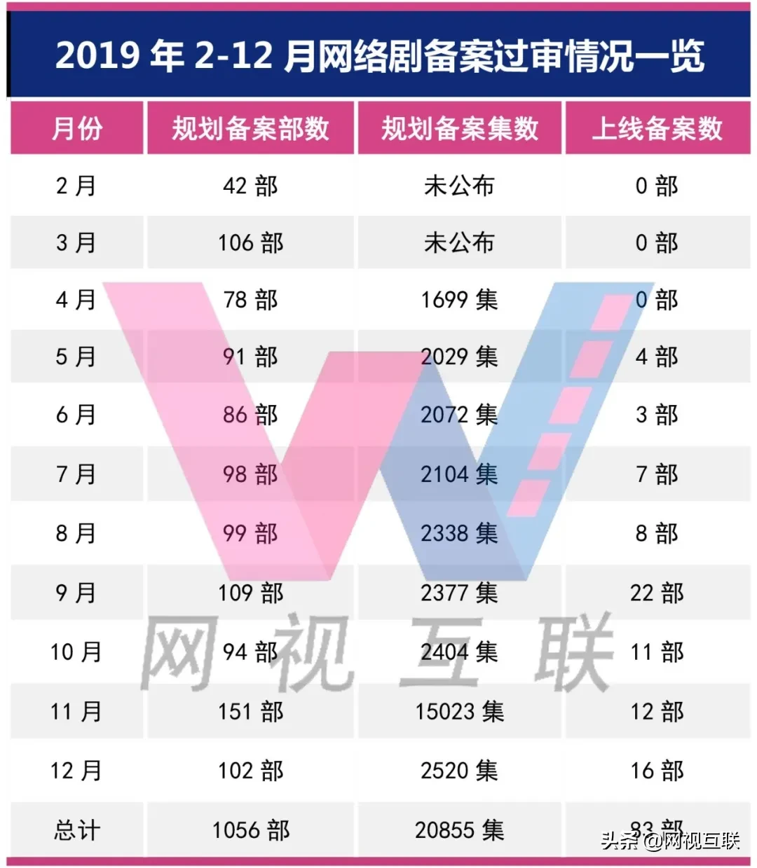 网视互联(id:wxs360)统计,虽然2019年2-12月份有1056部网络剧通过规划备案,但真正拍摄完毕并取得上线备案号的网络剧只有83部,占比仅7.86%。