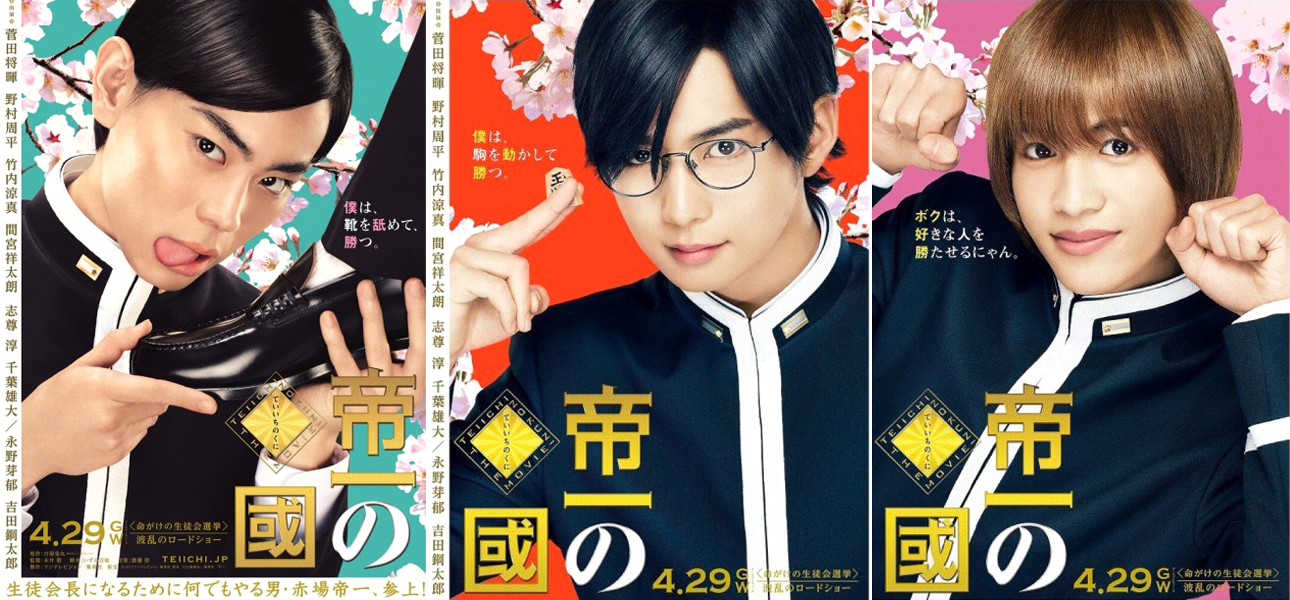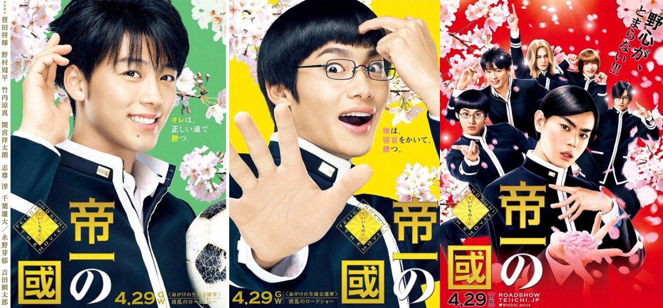 据悉,《帝一之国》预定2016年12月中旬至2017年2月上旬拍摄,将于2017年4月29日公映,前几个月里官方还相继公开了真人版电影的视觉海报和预告。《帝一之国》是古屋兎丸创作的从2010年开始连载在《jumpsq》上的漫画,真人版电影由《如果猫从世界上消失了》的导演永井聪掌镜,编剧则是《rookies》系列的泉吉紘,主演有菅田将晖、野村周平、竹内凉真、间宫祥太朗、志尊淳、千叶雄大、永野芽郁和吉田钢太郎等人,分别在电影中饰演赤场帝一、东乡菊马、大鹰弹、冰室ローランド、榊原光明、森园亿人、白鸟美美子和赤场让介。