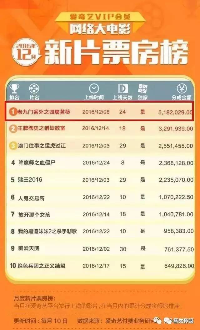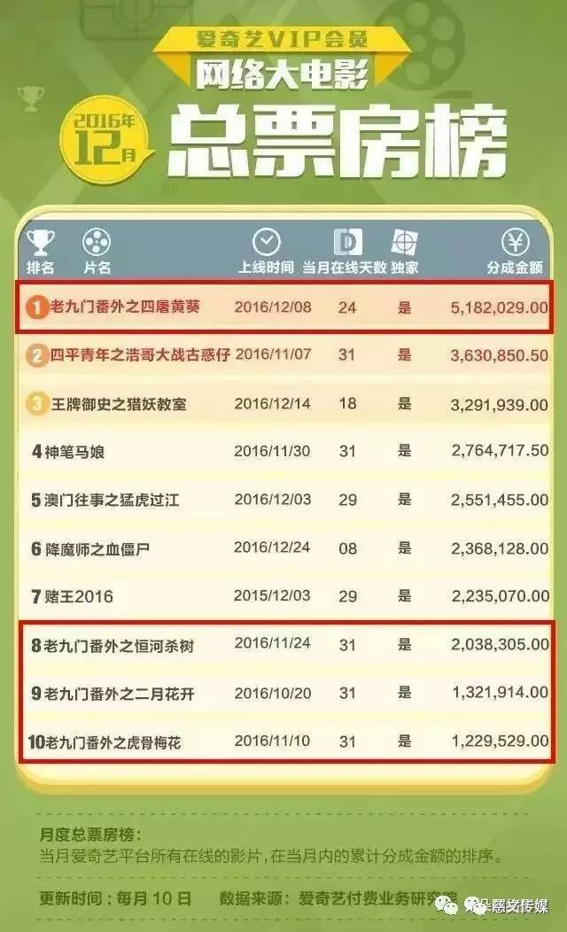 2016年12月份,《老九门》第一季的全部内容落下帷幕了,包括番外。爱奇艺新出炉的12月总票房榜中,《老九门番外》系列全部上榜,创造百亿点击神话的《老九门》魅力持续指数已然爆表。