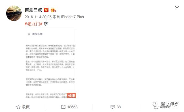 目前,原著作者、监制南派三叔表示《老九门》的小说已经开始持续更新,小说剧情发展延续电视剧中的主线情节,又填补了剧中一些没有表述到的情节,引发新的“追更”热潮,目前已更新的《老九门》单篇平均阅读量超过百万,书迷们纷纷留言与三叔互动。