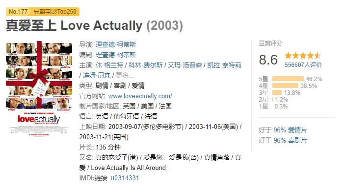 《真爱至上》上映于2003年9月7日,豆瓣评分8.6,imdb评分7.6。有网友评价:我的圣诞必备,年年都是看这个,年年心情大不同,有时候一个人,有时候两个人,有时候又是一群人,今晚又是一个人,心里偶尔想着另一个人,偶尔想着一群人。