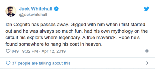 知名电视节目《十猫八选》(8 out of 10 cats)主持人吉米·卡尔(jimmy carr)在推特发文说,“资深喜剧演员柯尼托在舞台上去世了——这是真的。观众认为这是表演的一部分。在舞台上鞠躬尽瘁,这就是对喜剧的承诺。”
