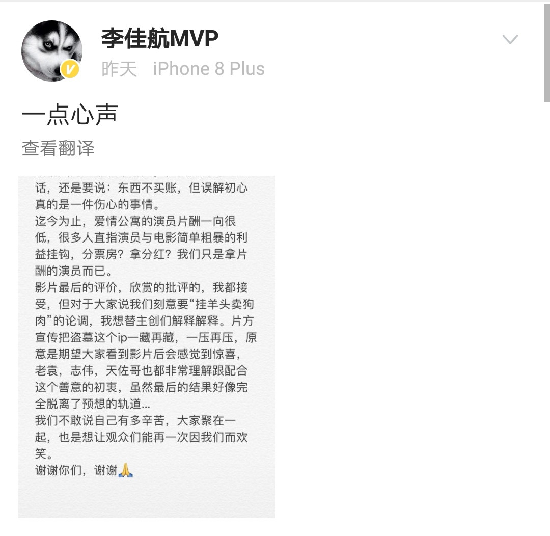 首先,李佳航就表明,爱情公寓的演员片酬一向很低,他们不会拿票房分红。