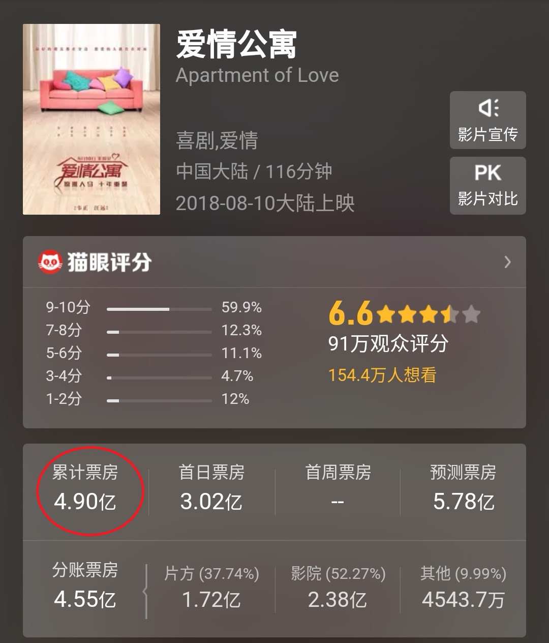 电影上映后,票房也是十分火热,根据猫眼专业版数据,截止8月12日24点,上映3天后,《爱情公寓》的总票房为4.9亿元,已经接近5亿元大关。
