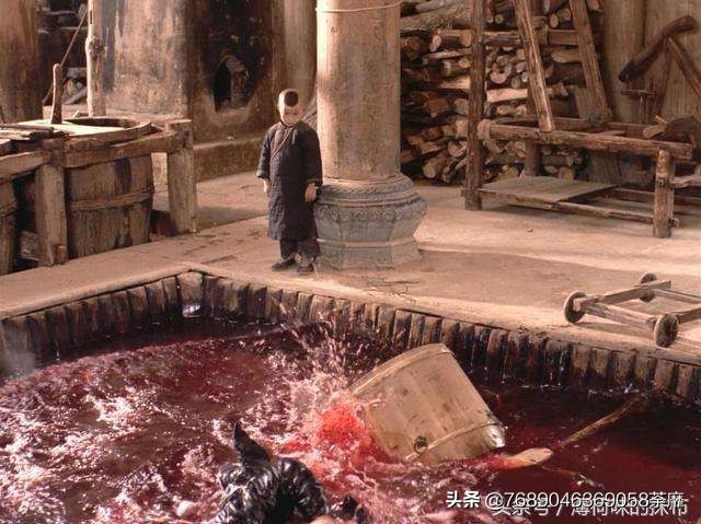 一天,老坊主在染池边逗小杨开心,却不慎栽进池里,诡异的一幕出现了,小杨眼看着人在池里挣扎求救,他不仅没有施以援手或者喊人,反而站一旁,露出令人毛骨悚然的笑容,等着菊豆看完病回家,老坊主早已淹了。