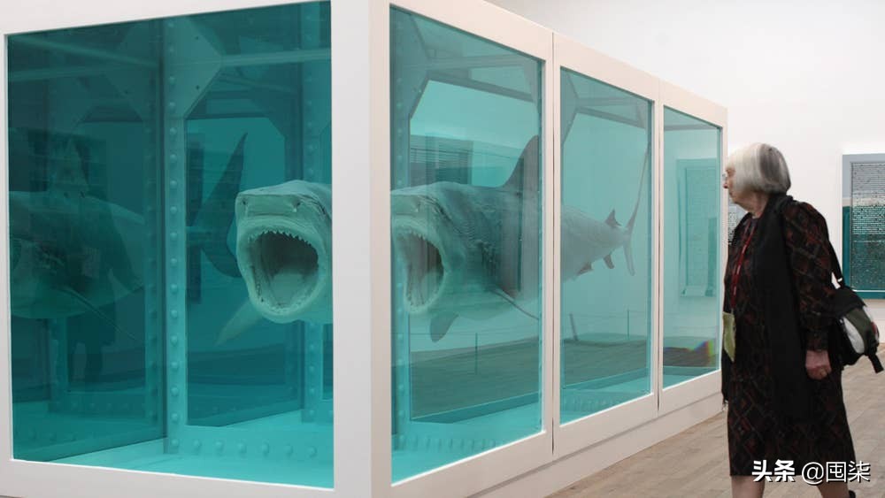 画室中,还有一个装满溶液的玻璃柜,里面漂浮着一个女孩。虽然不太确定导演是否有恶搞当代艺术之意,但这个女孩漂浮在玻璃柜中的画面,一下子就让我想起了英国艺术damien hirst于1991年创作的装置艺术作品the physical impossibility of death in the mind of someone living(生者对死者的无动于衷):一条14英尺长的大鲨鱼被放在装满甲醛的玻璃柜里。