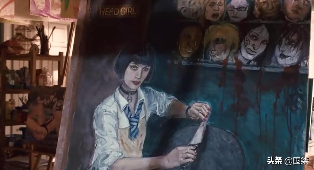 学校画室里的一幅画: head girl (注意剧照上方的英文)kelly jones正磨刀霍霍,她身后的壁柜上整齐地陈列着血淋淋的头颅。"head girl",一语双关:学校大姐头与割头颅的女孩。真的好冷啊!