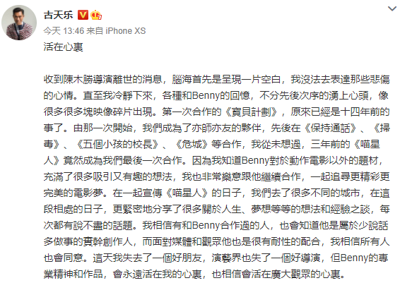 吴京、彭于晏、古天乐、谢霆锋纷纷发文悼念。