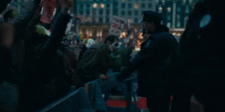就像电影里的一幕:示威者的牌子上写着“每个人都可以当小丑”。