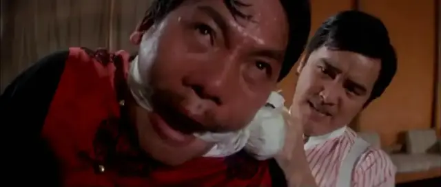 高手对决,最怕分神。富翁妹妹一喊叫,富翁就出神,然后富翁果不其然就挂掉了。可怜的富翁,承担了保护高先生的任务,结果,高先生还没到,自己就先挂了。富翁的饰演者是梁家仁,片中也算拗足了身形,拍足了造型,得到了张彻的厚爱,死得其所。