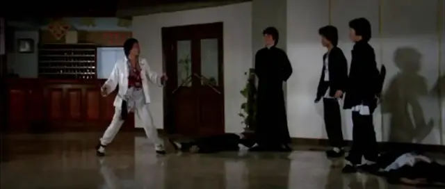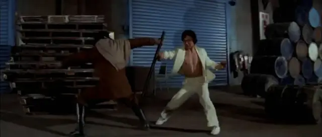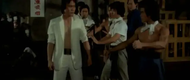 双方力量,好人开始占据上风。但好景不超过几秒钟。因为,一直埋伏在围观群众里的快刀项方出手了。结果,他是坏人。一出手,就重伤少爷,还ko了浪子。快刀项方的饰演者是程天赐,张彻第五代徒弟里他比较喜欢的一个。不过,咦?他怎么也穿了白衣,看来也药丸。