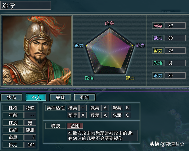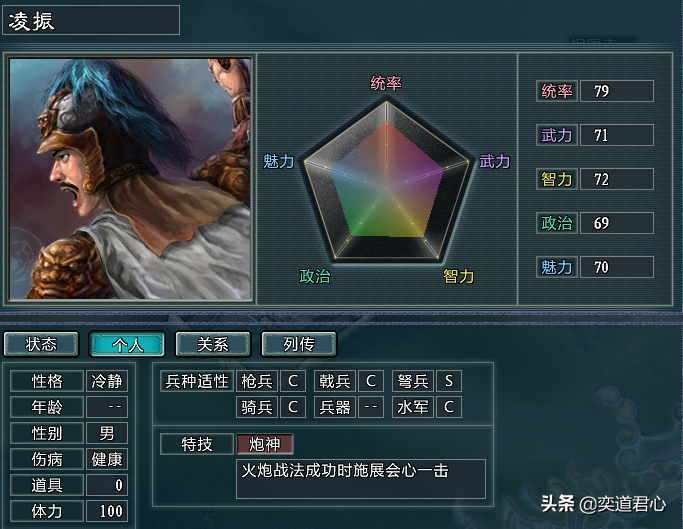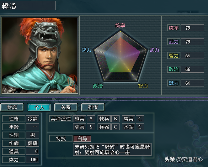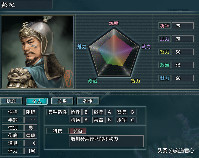 “天目将”彭玘与韩滔是搭档,在征讨梁山的战斗中被扈三娘生擒,归顺梁山后排名第四十三。扈三娘是女流,彭玘与她交战主要还是轻敌才失败,他的真实水平是跟花荣打了二十多个回合。顺带补充一句,凌振也是彭玘劝降的,他最终战死在了方腊战役。游戏配置给彭玘的特技是长驱,只能增加骑兵的机动力,综合水平大致相当于原版三国志11的夏侯霸。