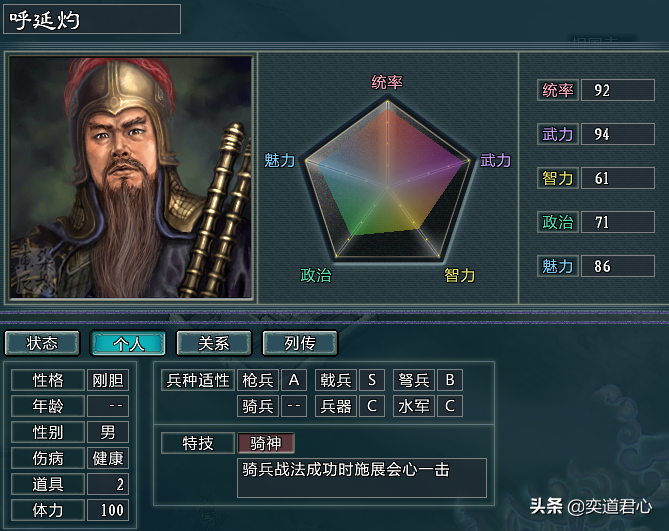 大宋开国名将呼延赞的后代,有着“双鞭”称号的呼延灼,官居汝宁郡的都统制,是梁山官军派系里军职最高的人物。此时他还没有投降梁山,正全心全意地效力于宋徽宗。凭借着祖宗积攒的政治资本,呼延灼并不在蔡京高俅等人的暗害名单里,征讨方腊结束后被封为御营兵马指挥使,最后在与金兵的交战中壮烈殉国。游戏配置给呼延灼的特技是骑神,高战死模式下对于敌方将领的生命威胁非常大。呼延灼的道具踏雪乌骓马,还为他附加了疾驰效果,对手遭他一撞,不死也会脑震荡。