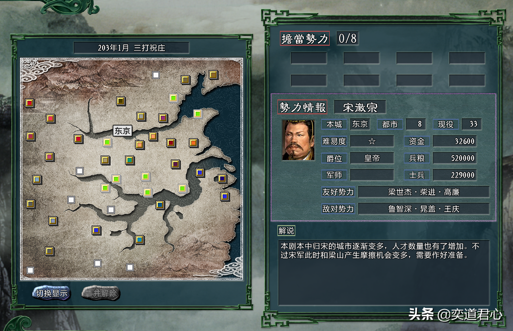 尽管“三打祝庄”剧本的宋徽宗刷新出了那么多优质战斗人才,可他的脸上依旧看不到半点喜悦。因为以呼延灼为代表的这些大宋骁将,都是宋江最最忠实的粉丝,玩家甚至不敢委任都督和太守的职务,他们在三国志11水浒mod里早晚都是宋江的菜。