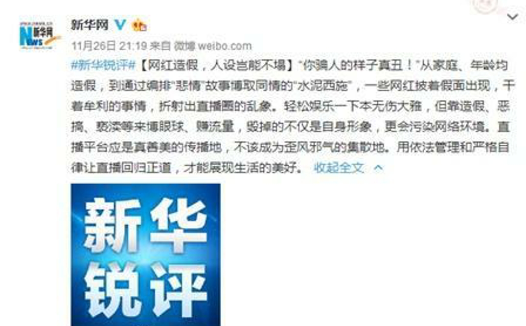 新华网还特别对“水泥妹”做出了点名评论:“你骗人的样子真丑”。