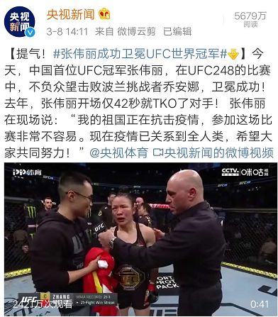 前几天的拉斯维加斯格斗赛,张伟丽又一次站上ufc擂台。