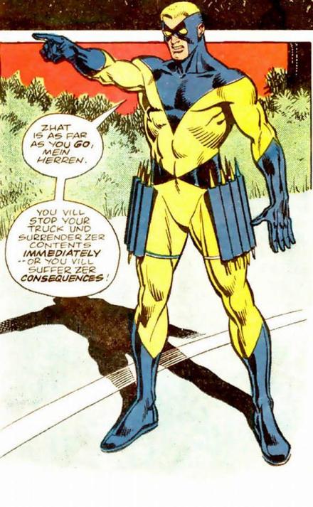 " 黑色守卫本名richard "dick" hertz,名字听起来就很diao,初次登场于1986。这个角色在漫画中只是一个十八线罪犯,曾被一个名为the 1000的反派组织招募,得到了创造能量护盾和流星锤的能力。