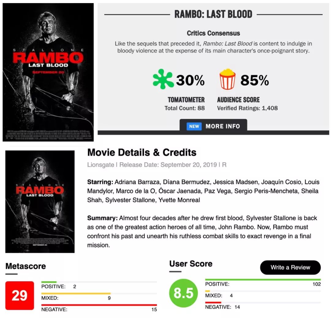 在烂番茄,《第一滴血5》专业番茄评分仅为30%,大众爆米花则高达85%。在评分最苛刻的metacritic也一样,专业评分仅为29分(满分100分),大众评分为8.5分(满分10分)。