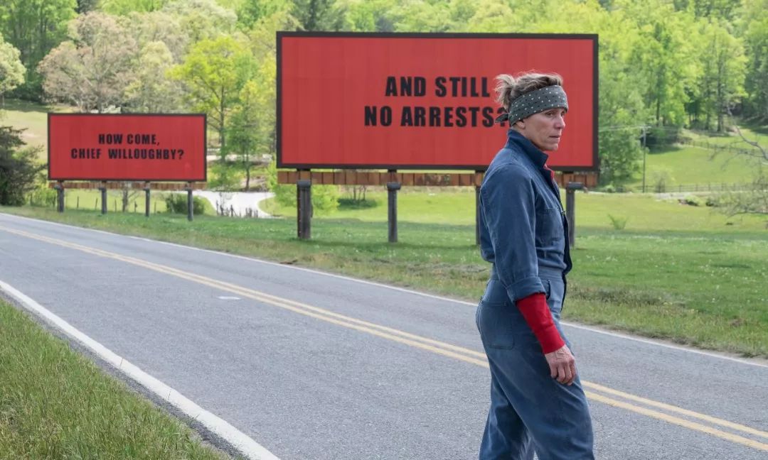 我们再来看《三块广告牌》,事件本身是女主女儿被强奸致死,所以女主要立广告牌督促警方查明真相。
