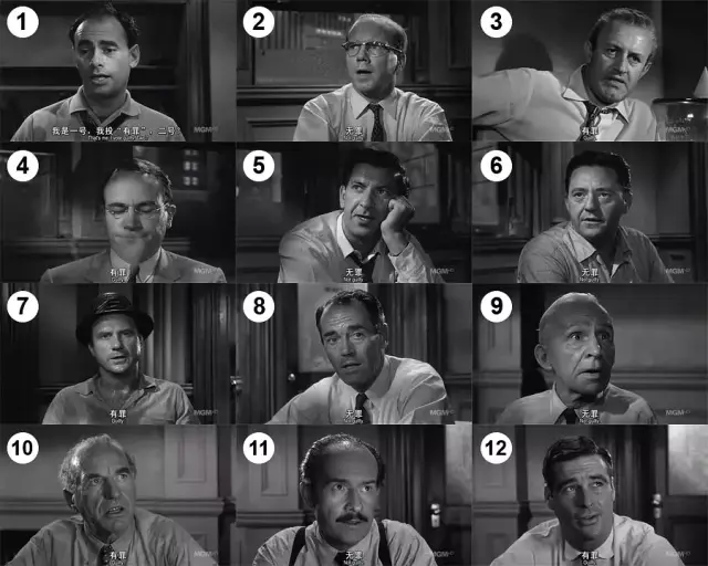 亨利·方达形象上是个严肃脸,自带主角正义光环,非常适合扮演这个唱反调的8陪审员。亨利·方达在首轮投票中投了反对票,也许是鬼使神差地想讨论一下这个案子,也许真的认真思考了整个案情。他最先提出了疑点,于是其他陪审员同志们努力要说服他,反而被他说服。这个案子看似证据确凿,其实存在的漏洞也很多。同志们纷纷发掘出漏洞,提出了更多疑点,开始自我批评并说服彼此,造成这个案件最终逆转,少年从有罪变成了无罪。