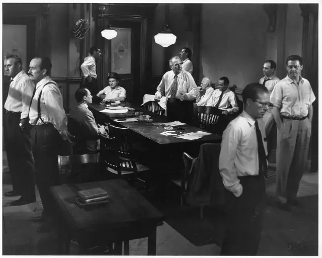 这部1957年上映的电影现在看起来有点奇怪,黑白基调像是一部闷片。镜头只对准了十二个男人,场景只有一个封闭的房间里。看似是探讨一个案子,实际上是人性和制度的角逐。这是一部很容易被剧透的电影,故事很容易被描述出来:一个室内场景,十二个人,讨论一个男孩是否有罪。