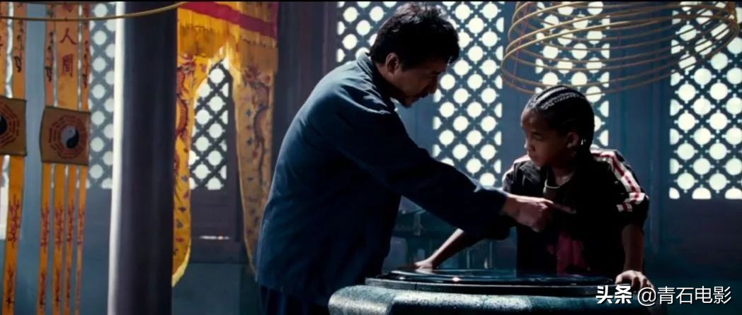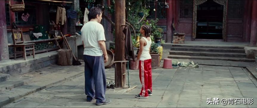 影片从一开始对德雷随便乱丢衣服,对妈妈不尊重的表现,到后来韩师傅教导他日复一日机械性地重复“捡起-挂起-拿下-穿上-脱下外套”的动作中反省了自己。