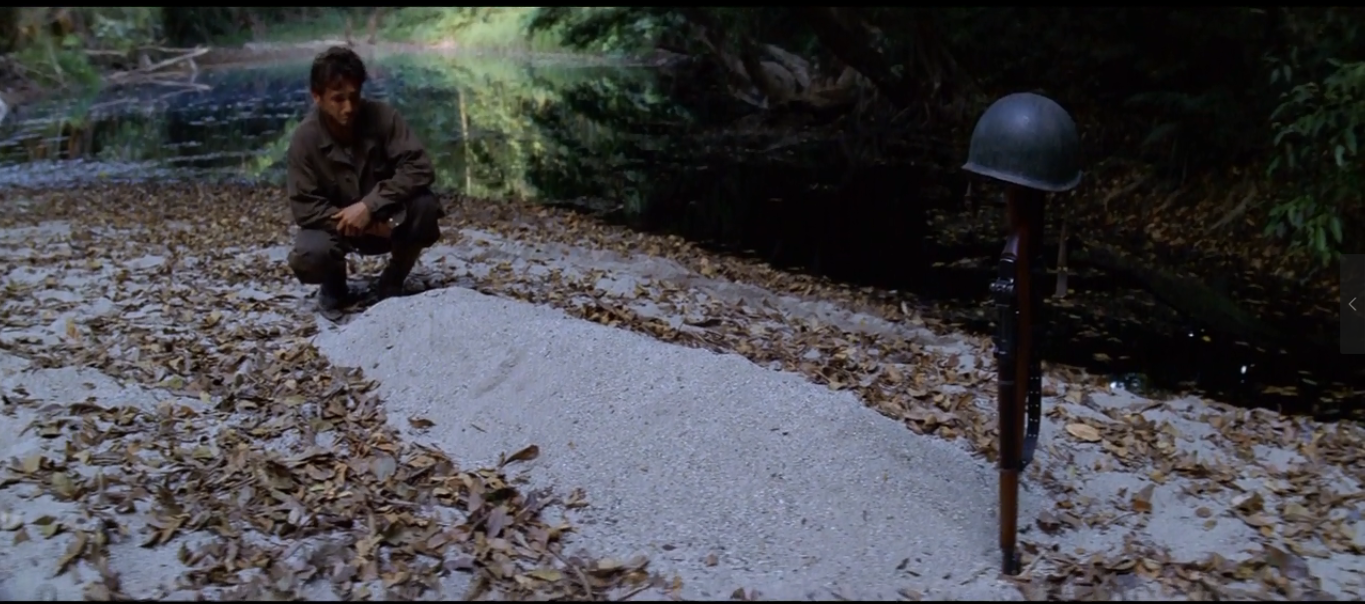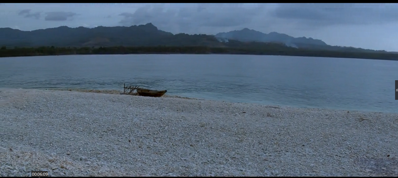 影片的开头,贝尔身处在一处安静的南太平洋小岛上,仿佛一处战争之外的桃花源与乌托邦。在影片结尾前,又是几组舒缓的长镜头,一个士兵伫立在船头,看着船后留下的水花。