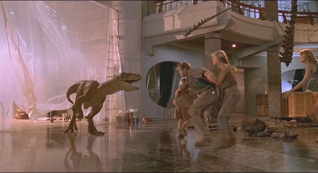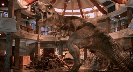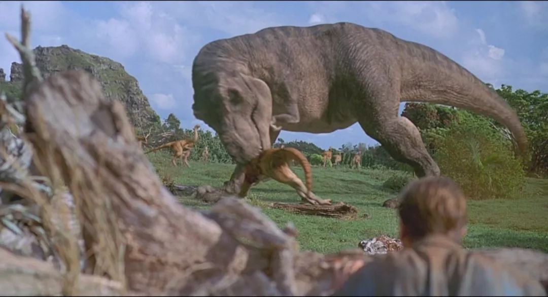 兰特他们趁机逃出了大厅,而霸王龙把两头伶盗龙咬死,留下了电影中最经典的一个仰天长啸的画面。