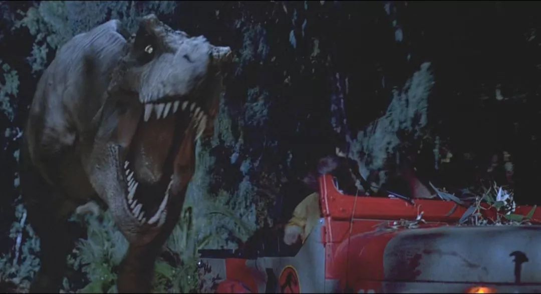 随后霸王龙又气势汹汹地折返,将游览车推下悬崖,格兰特带着两个小孩躲过了袭击,但他们也和马尔科姆失散了。
