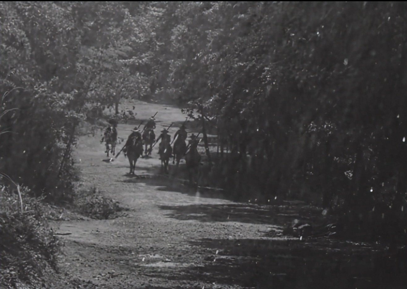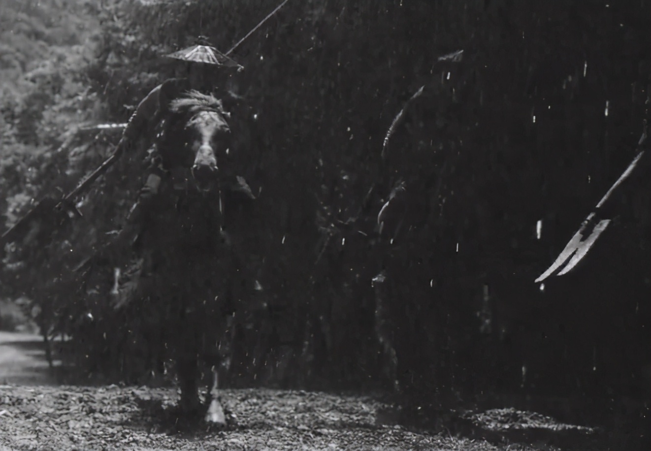还有运动中的群体状态,人物背景中的落雨,以及低垂乱颤的树枝。