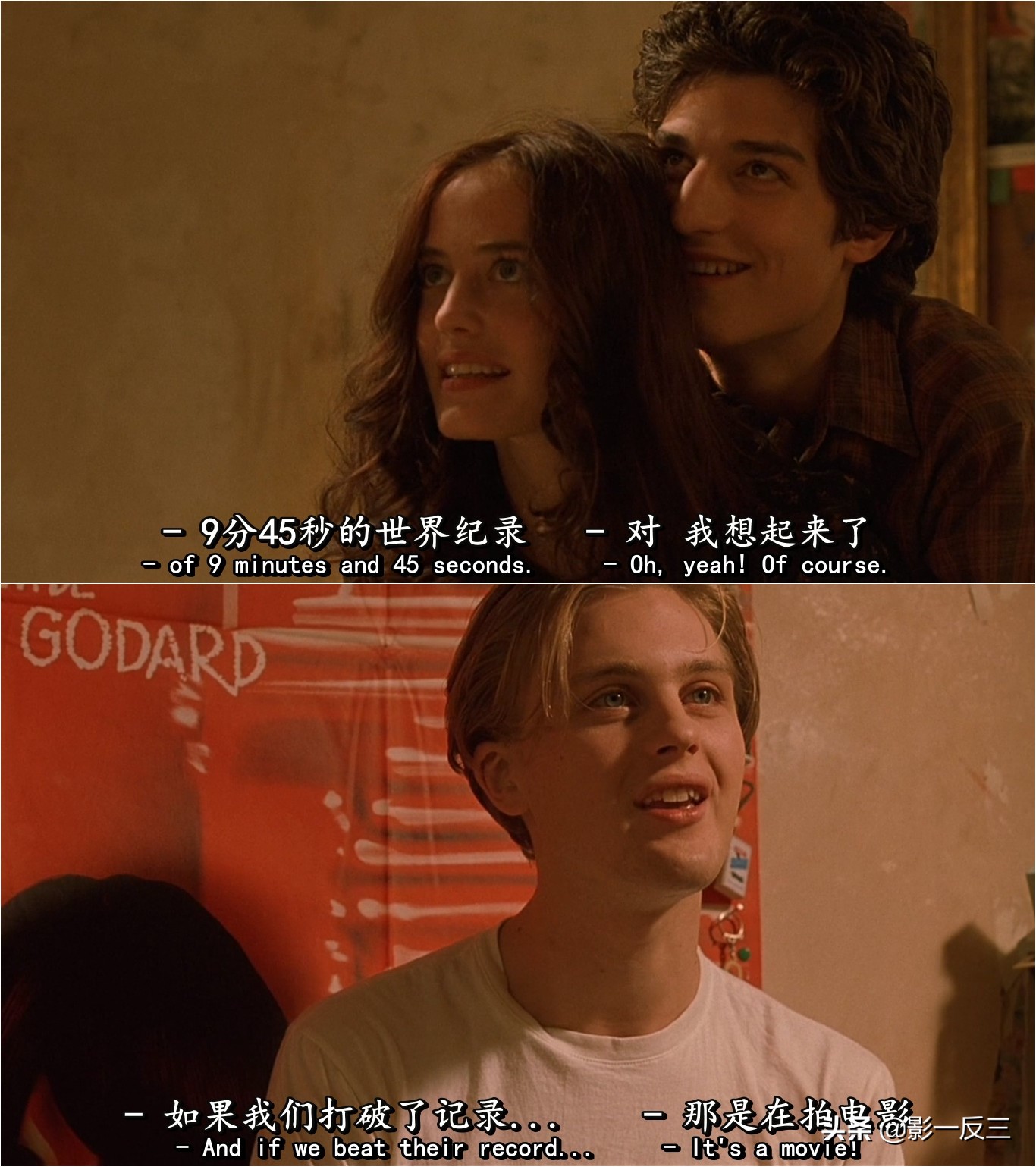 三个纯粹的年轻人,坦诚相待,相互表达着自己,怡然自得。外面的游行示威活动如火如荼,而他们却停留在自己的世界里:一起研究电影,讨论“基顿和卓别林哪个更伟大”;认真考虑打破电影《法外之徒》里横穿卢浮宫的跑步纪录;他们会玩“猜电影”的游戏,猜不出来就要接受惩罚,而惩罚内容突破你的想象。这就是一个超级版“真心话大冒险”,因为他们敢玩真的!事情朝着好玩的方向发展着……