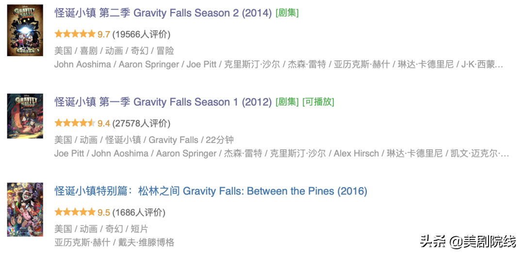 《怪诞小镇》一共只有两季,外加一部电影特辑,豆瓣上9.4-9.7分。